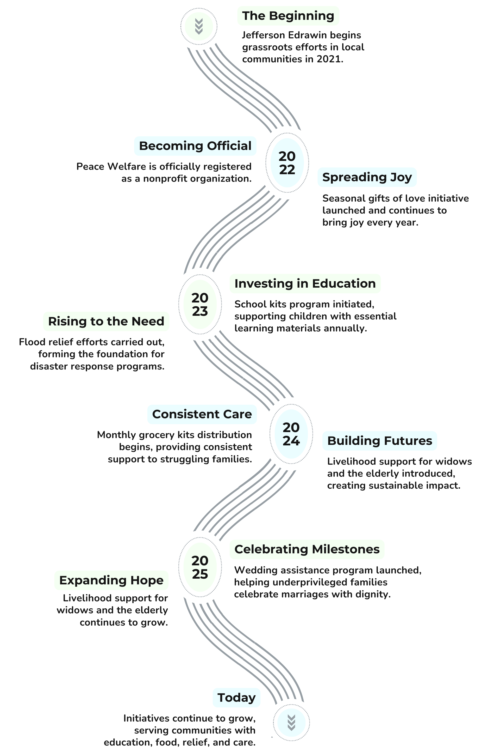 Peace Welfare began as one man’s calling to meet the needs of the forgotten. Founder Jefferson Edrawin was deeply moved by the struggles he saw in disadvantaged communities — children without school supplies, widows without income, elders without care.